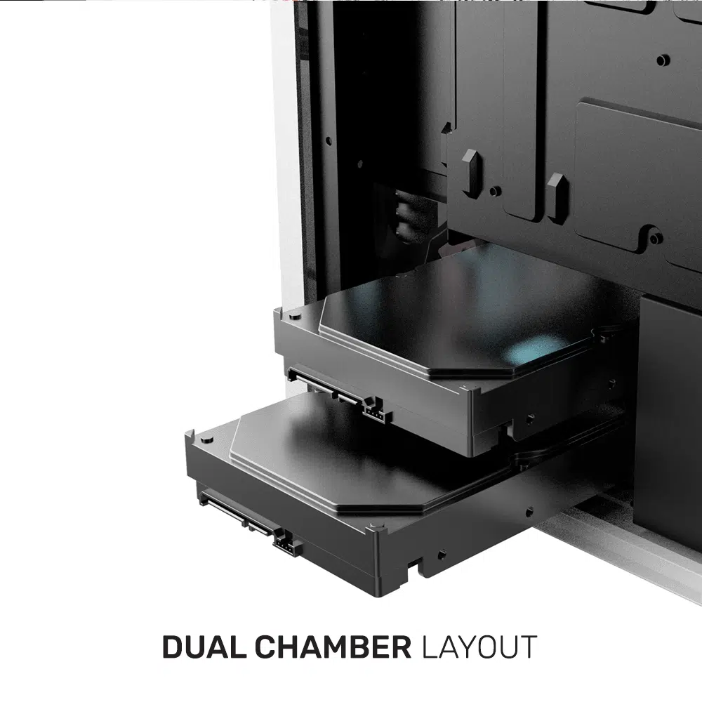 • Διπλός Θάλαμος: Χωρίζει τη μητρική πλακέτα και την GPU από τον τροφοδοτικό και την αποθήκευση, βελτιώνοντας τη ροή αέρα και την αποδοτικότητα ψύξης.