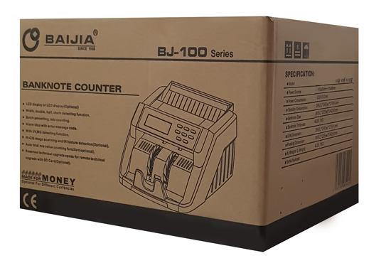 Καταμετρήστε μεγάλες ποσότητες χαρτονομισμάτων εύκολα και γρήγορα με τον μετρητή και ανιχνευτή χαρτονομισμάτων BJ-100Value της BAIJIA. Μπορεί να καταμετρήσει ταξινομημένα και αταξινόμητα χαρτονομίσματα, με ταχύτητα έως και 1000 ανά λεπτό και να αναγνωρίσει με αξιοπιστία τυχόν πλαστά χαρτονομίσματα.