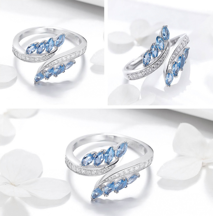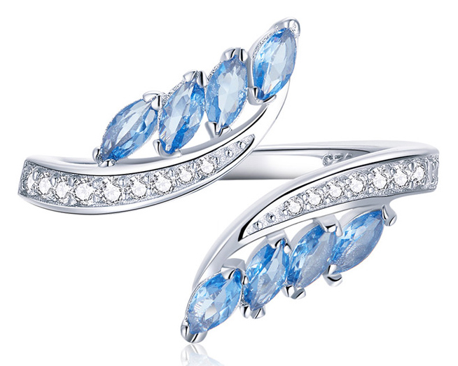 Κομψό δαχτυλίδι σε σχέδιο φύλλου ιτιάς, διακοσμημένο με αστραφτερή κυβική ζιρκόνια, λευκού και μπλε χρώματος, η οποία προσφέρει μοναδική λάμψη στο κόσμημα.