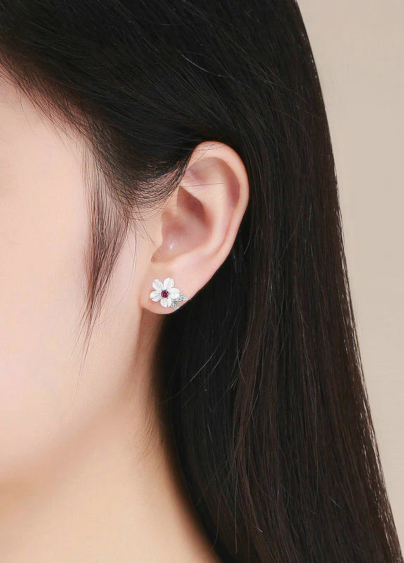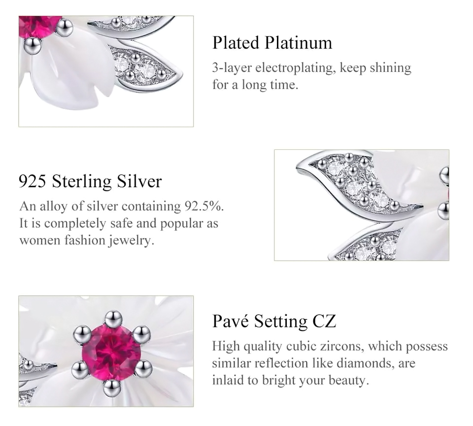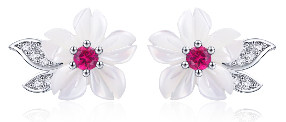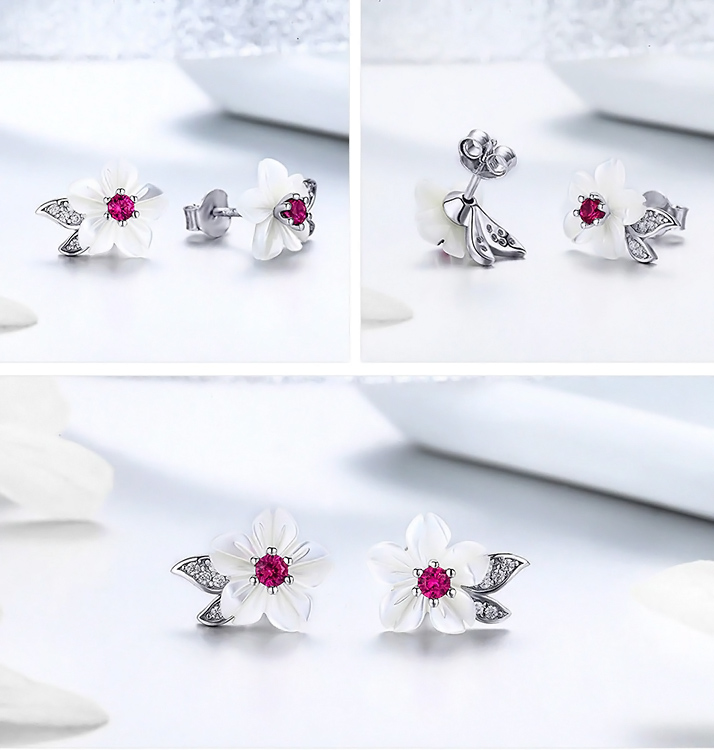 Εντυπωσιακά σκουλαρίκια Bamoer σε σχήμα λουλουδιού, κατασκευασμένα από ασήμι 925 και mother of pearls, διακοσμημένα με κυβική ζιρκόνια σε λευκό και ροζ χρώμα.