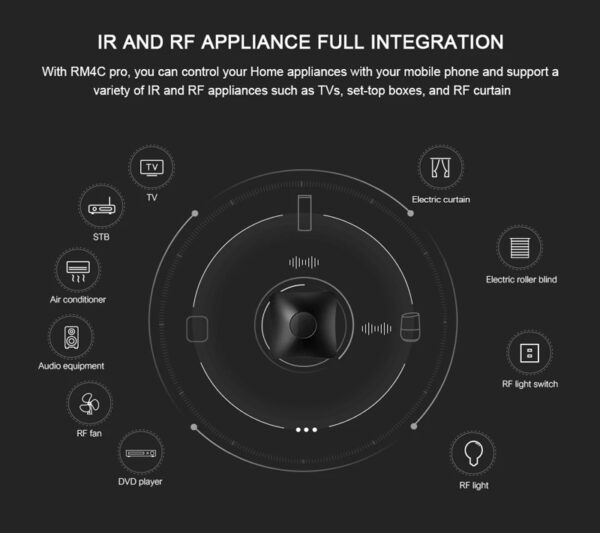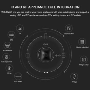 Το RM4 Pro είναι ένα σύστημα τηλεχειρισμού ηλεκτρικών συσκευών IR/RF μέσω της εφαρμογής BroadLink για smartphone. Με το Alexa ή το Google Assistant, σας προσφέρει φωνητικό έλεγχο των συσκευών σας, όπως ενεργοποίηση/απενεργοποίηση της τηλεόρασής σας ή αύξηση/μείωση της έντασης του ήχου. Επιπλέον υποστηρίζει εξωτερική ανίχνευση θερμοκρασίας και υγρασίας του χώρου όπου βρίσκεται η συσκευή.