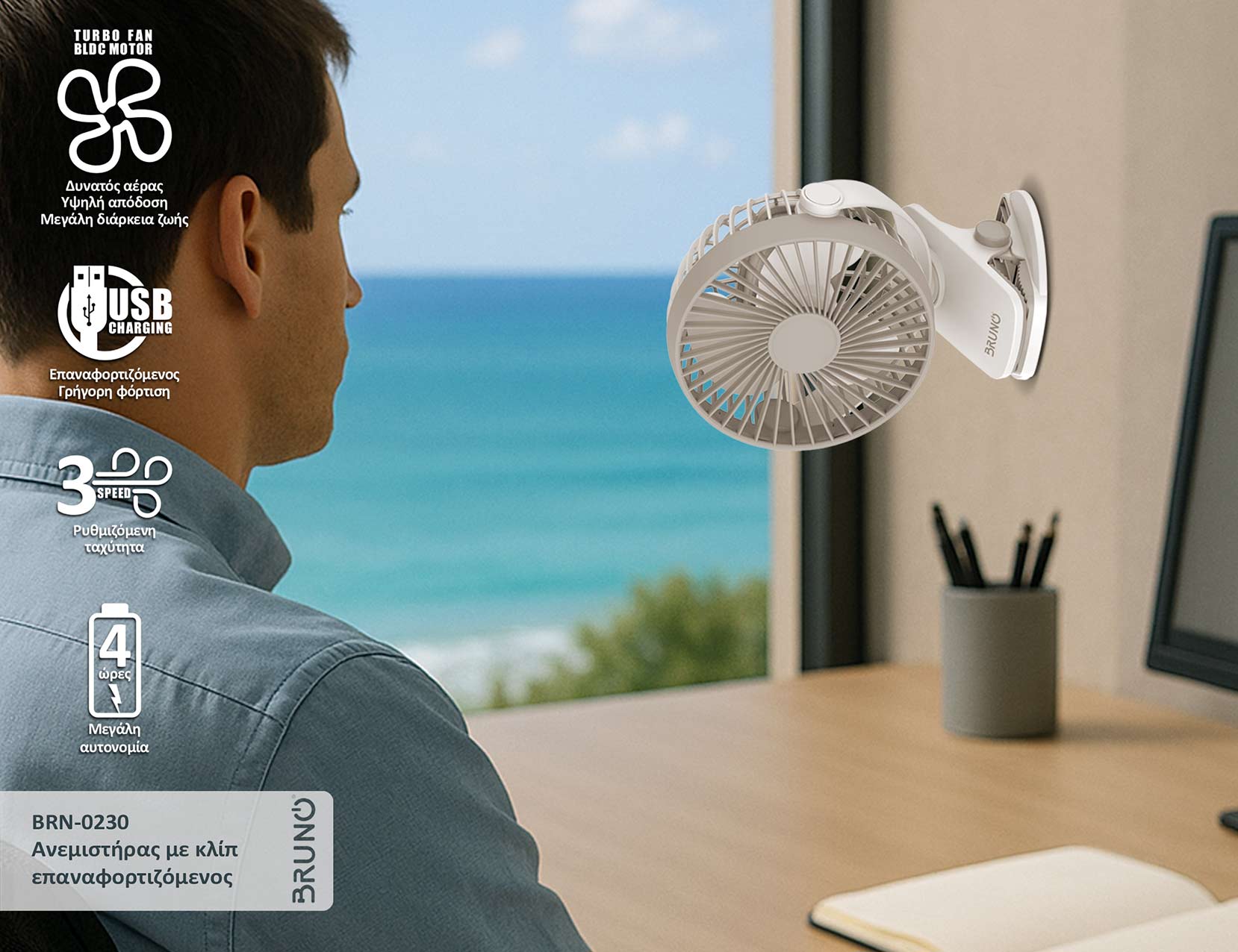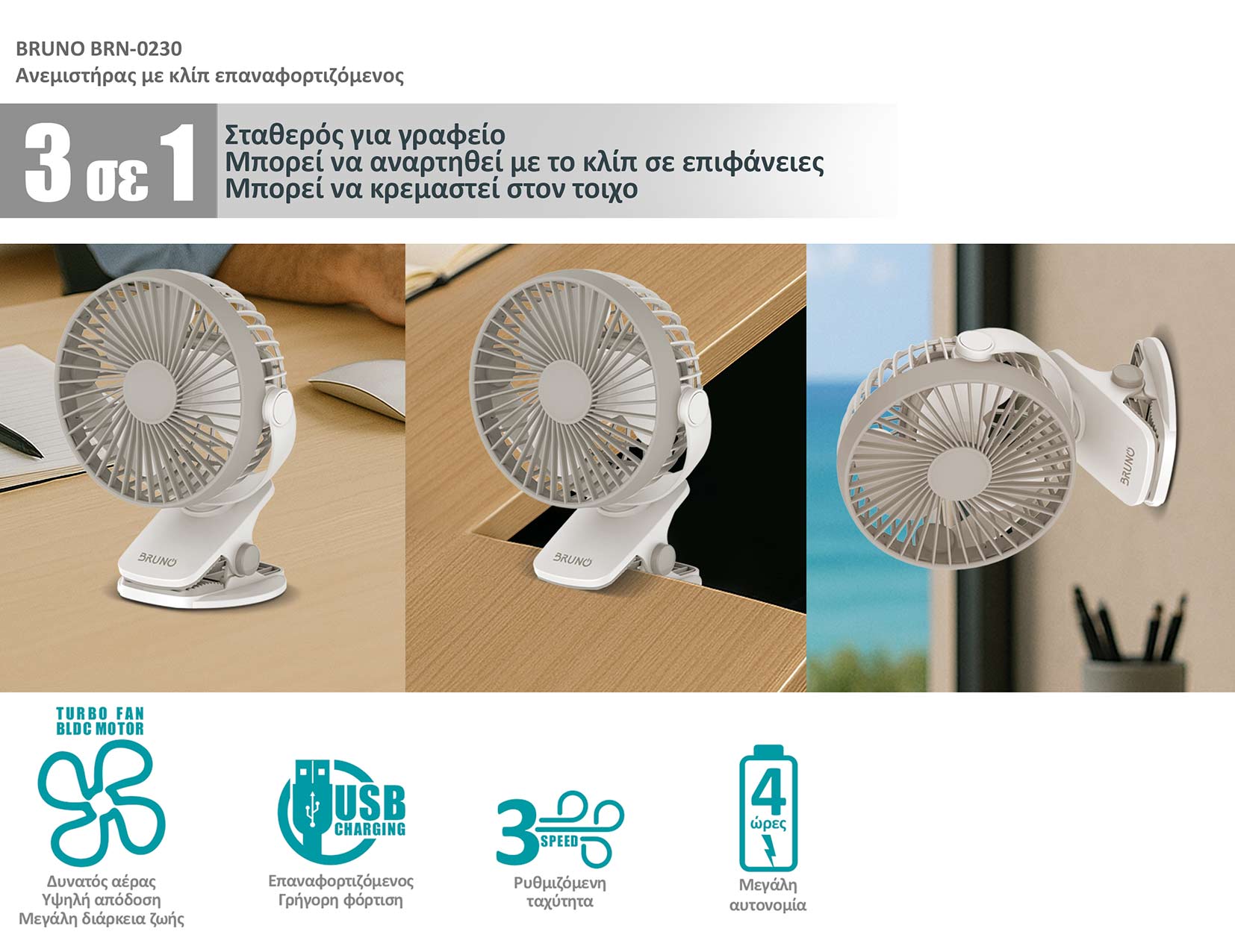 • BRUNO BRN-0230 Ανεμιστήρας με κλίπ επαναφορτιζόμενος