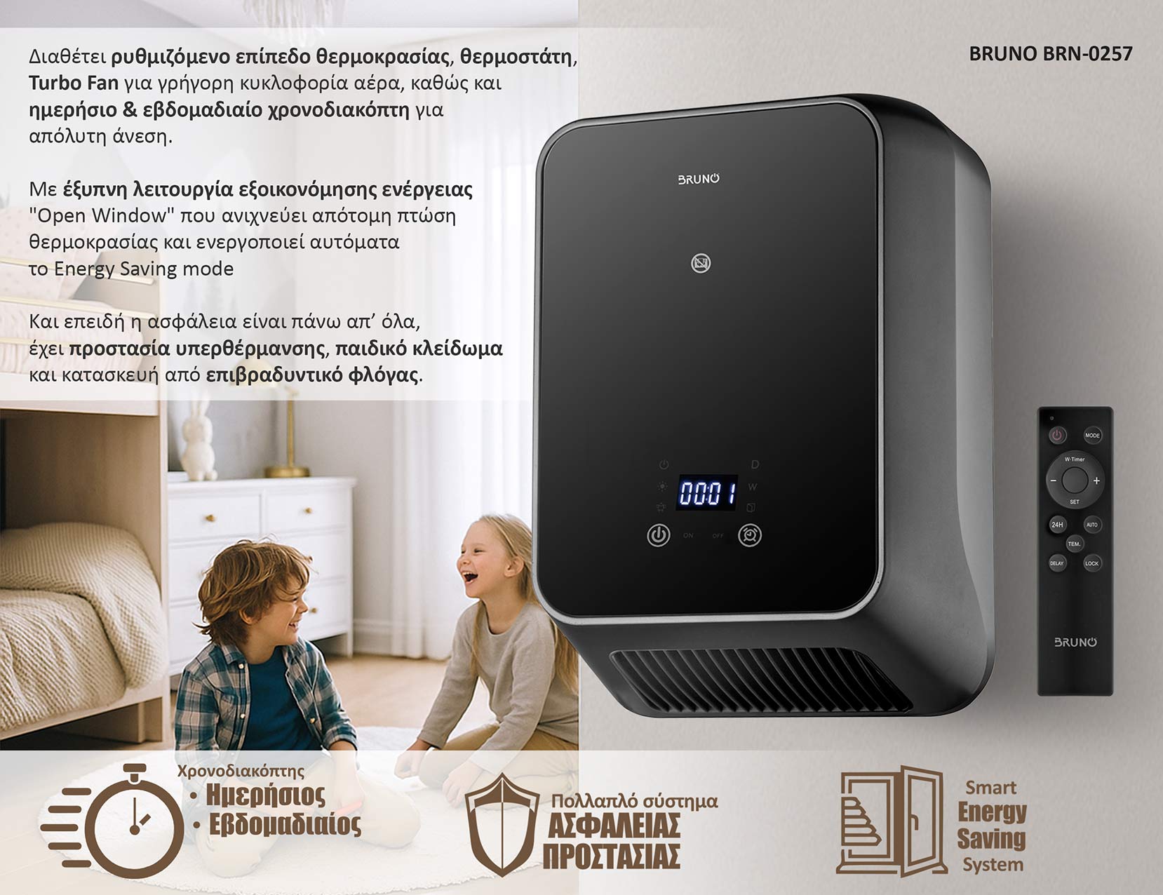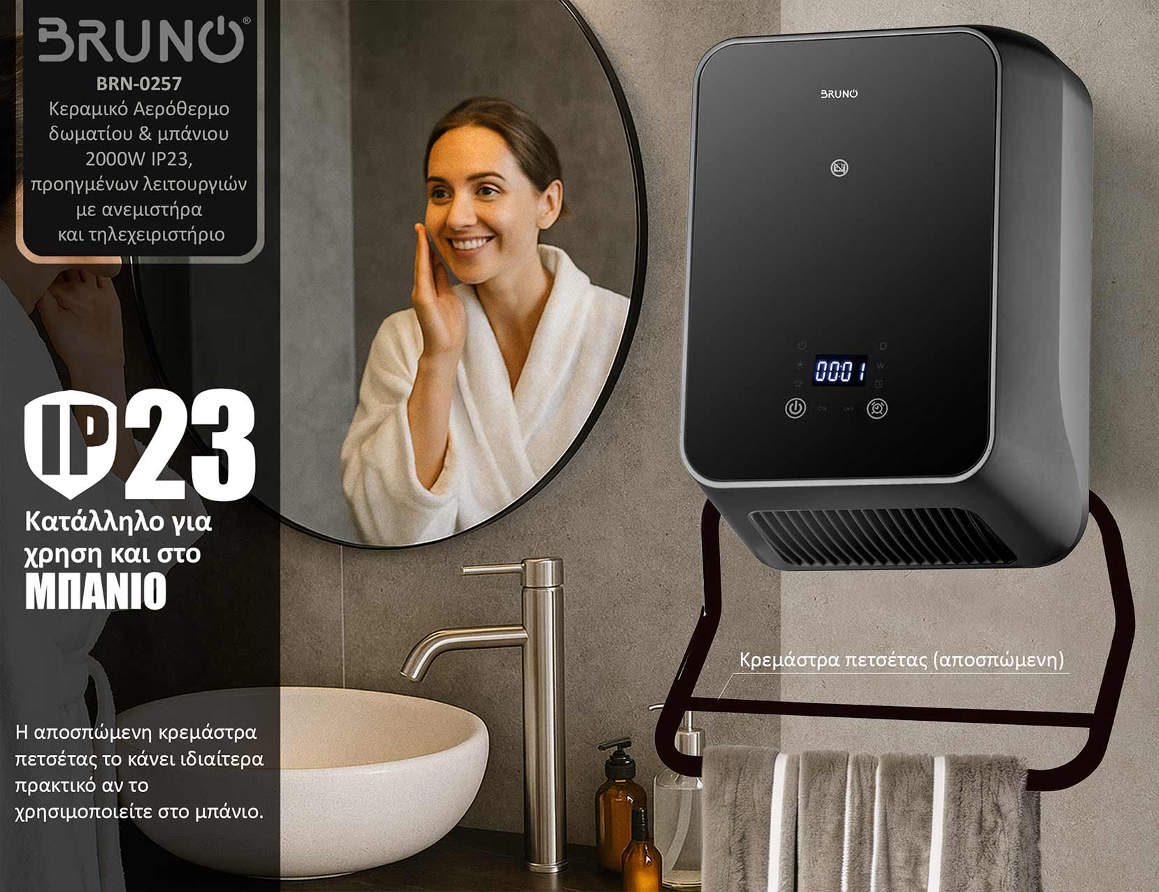 BRUNO BRN-0257 κεραμικό αερόθερμο δωματίου & μπάνιου 2000W IP23, προηγμένων λειτουργιών με ανεμιστήρα