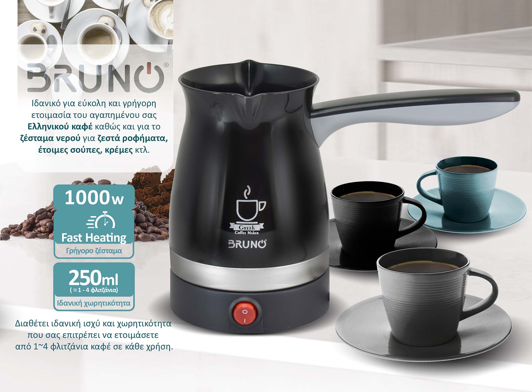 Το ηλεκτρικό μπρίκι BRUNO BRN-0187 είναι ιδανικό για εύκολη και γρήγορη ετοιμασία του αγαπημένου σας Ελληνικού καφέ καθώς και για το ζέσταμα νερού για άλλα ζεστά ροφήματα, έτοιμες σούπες, κρέμες κτλ.