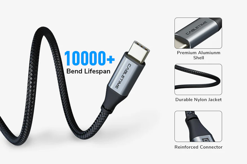 Καλώδιο φόρτισης και μεταφοράς δεδομένων USB-C σε USB-C της Cabletime. Υποστηρίζει φόρτιση με απόδοση έως 100W και μεταφορά δεδομένων με ταχύτητα έως 480Mbps.