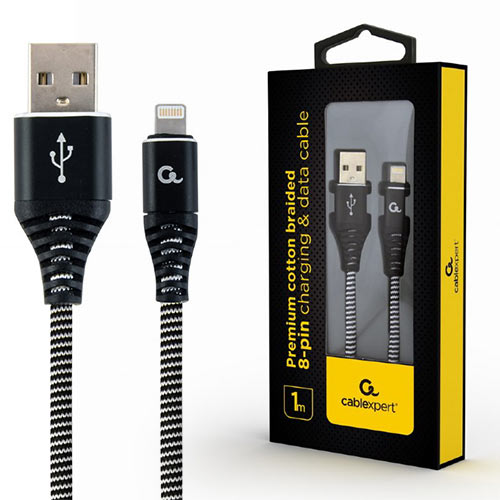 CABLEXPERT PREMIUM COTTON BRAIDED LIGHTNING CHARGING AND DATA CABLE 1M BLACK/WHITE RETAIL PACK