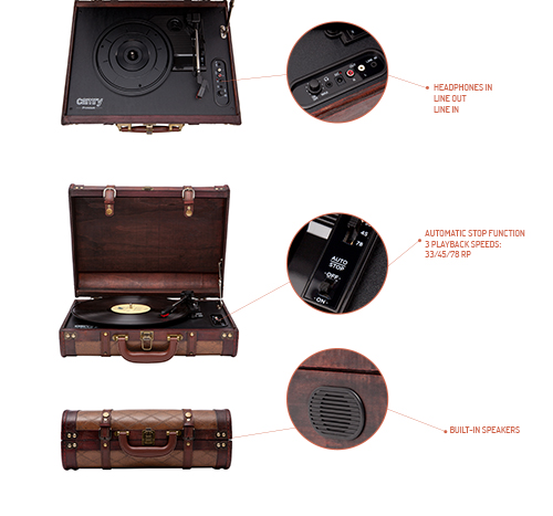 Το Suitcase Turntable Camry 1149 συνδέεται με στιγμές που υπήρχε μουσική από βινύλια κατά τη διάρκεια γευμάτων μεταξύ της υψηλής κοινωνίας, καθώς και σε χαρούμενα χορευτικά πάρτι. Σήμερα είναι μια τέλεια επιλογή για γνώστες που εκτιμούν όχι μόνο την ποιότητα της μουσικής αλλά και τον μοναδικό σχεδιασμό του πικάπ.