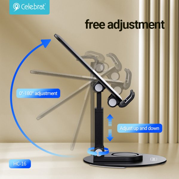 Επιτραπέζια βάση της Celebrat, κατάλληλη για χρήση με smartphone και tablets. Είναι ρυθμιζόμενη ως προς την γωνία κλίσης αλλά και το ύψος ώστε να βρείτε το ιδανικό σημείο προβολής. Επιπλέον, διαθέτει εγκοπή στο κάτω μέρος, προσφέροντας χώρο στο καλώδιο φόρτισης.