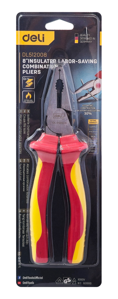 DELI πένσα ηλεκτρολόγου DL512008 με αντιολισθητικές λαβές, VDE 1000V, 200mm