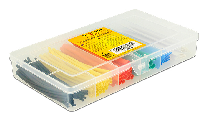 Το σετ περιλαμβάνει 100 θερμοσυστελλόμενα σε 6 διαφορετικές διαμέτρους και χρώματα. Είναι τοποθετημένα μέσα σε πλαστικό κουτί για την ταξινόμηση και προστασία των μονωτικών το οποίο μπορεί να επαναχρησιμοποιηθεί για την αποθήκευση διαφόρων αξεσουάρ.