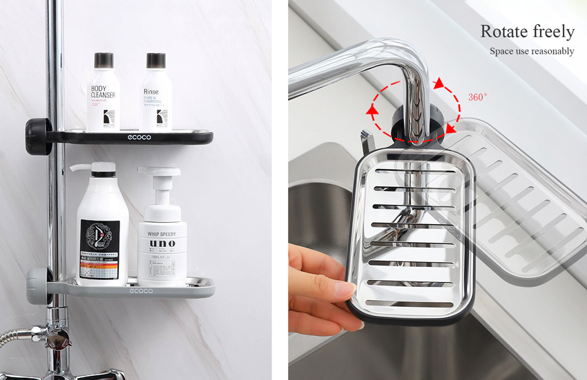 Βάση στήριξης σε σωλήνα νεροχύτη της Ecoco με δυνατότητα περιστροφής 360°, ιδανική για την κουζίνα ή το μπάνιο. Στην βάση μπορούν να τοποθετηθούν σφουγγάρια, σαπούνι, σαμπουάν, αφρόλουτρο και λοιπά είδη περιποίησης.