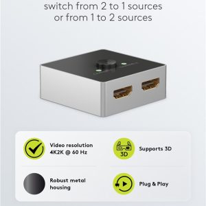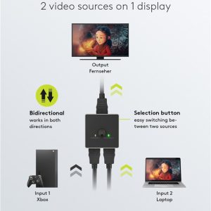 Το HDMI switch της Goobay σας επιτρέπει την εύκολη εναλλαγή μεταξύ 2x συσκευών εισόδου όπως PC ή gaming κονσόλες σε 1x συσκευή εξόδου όπως οθόνη ή τηλεόραση. Η εναλλαγή γίνεται μέσω πλήκτρου.