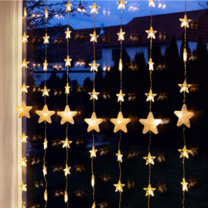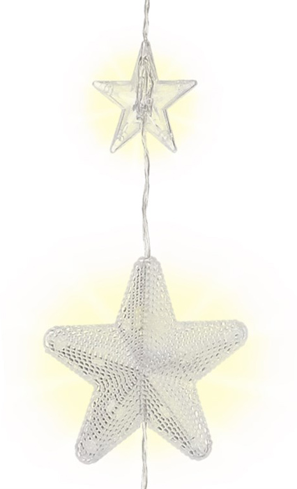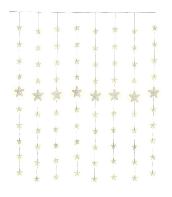 Λαμπάκια LED τύπου (80 LEDs) κουρτίνα με διακοσμητικά αστέρια, διαφανές καλώδιο συνολικού μήκους 6.05m και θερμοκρασία χρώματος 3000K (θερμό λευκό). Είναι ιδανικά για την χριστουγεννιάτικη διακόσμηση σε οποιονδήποτε εσωτερικό και εξωτερικό χώρο χάρη στον βαθμό προστασίας IP44.