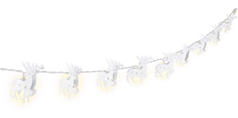 Λαμπάκια LED με διακοσμητικούς μεταλλικούς τάρανδους σε λευκό χρώμα που συνδέονται με ένα διαφανές καλώδιο συνολικού μήκους 1.3 μέτρα. Είναι ιδανικά για την χριστουγεννιάτικη διακόσμηση σε οποιονδήποτε εσωτερικό χώρο.