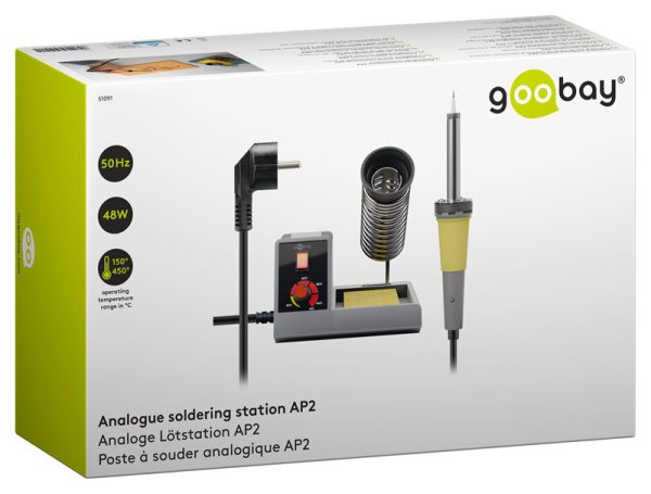 Αναλογικός σταθμός συγκόλλησης AP2 της Goobay, ιδανικός για την εκτέλεση όλων των ειδών συγκόλλησης στο σπίτι. Εξοπλίζεται με κουμπί ενεργοποίησης/απενεργοποίησης και ρύθμισης της θερμοκρασίας. Ο χρόνος θέρμανσης του είναι εξαιρετικά μικρός επιτρέποντας την άμεση χρήση του ενώ παράλληλα παρέχει υψηλό επίπεδο σταθερότητας κατά την εργασία.