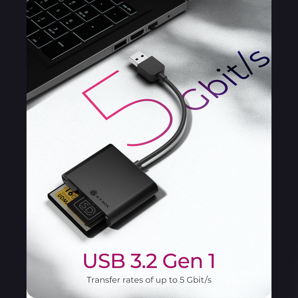 Η θύρα USB 3.0 επιτρέπει γρήγορη μεταφορά δεδομένων, ακόμα και για μεγάλα αρχεία. Ωστόσο, αν η USB 3.0 δεν είναι διαθέσιμη, ο ICY BOX CARD READER είναι συμβατός με τις θύρες USB 2.0 και 1.1, επιτρέποντάς σας να τον χρησιμοποιείτε ακόμα και με παλαιότερες θύρες.