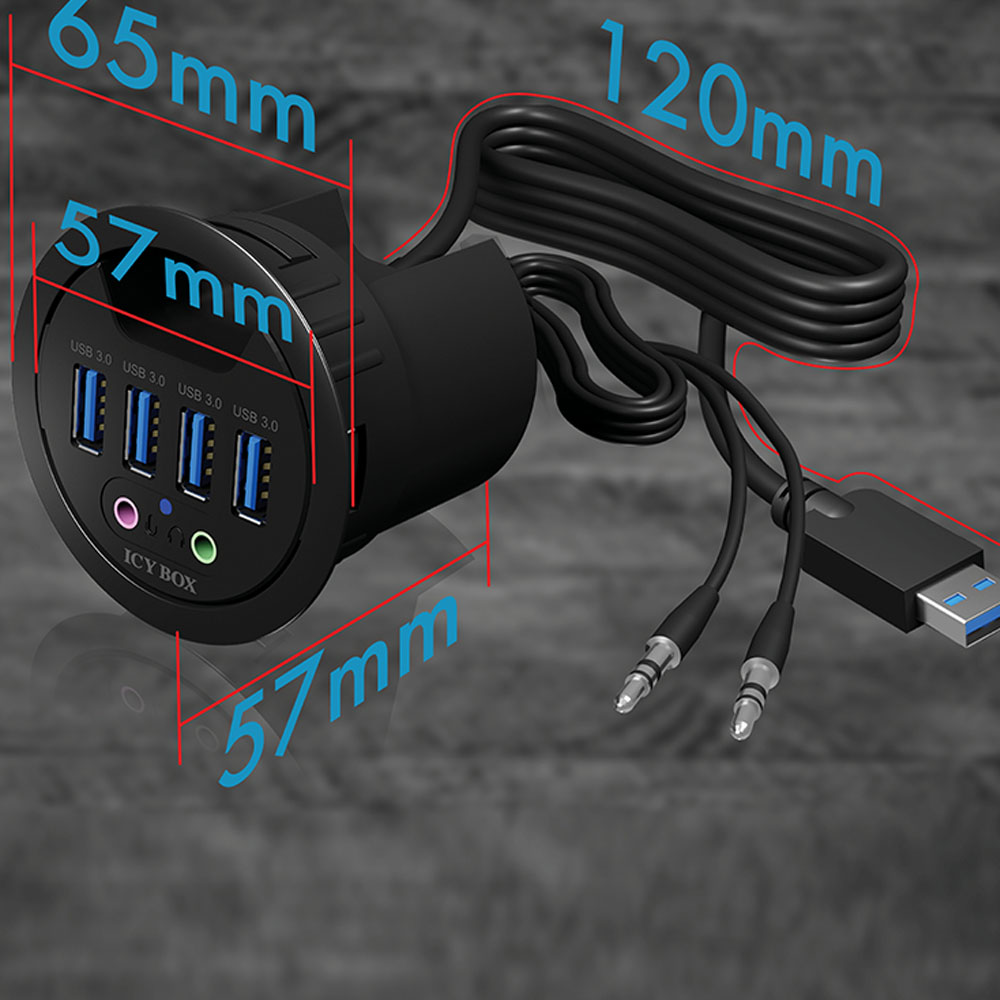 Ο κόμβος ICY BOX προσθέτει τέσσερις θύρες USB 3.0 Type-A σε μια υποδοχή καλωδίων 60 mm. Παρόλα αυτά, η υποδοχή καλωδίων μπορεί να παραμείνει διαθέσιμη για καλώδια οθόνης ή ρεύματος.