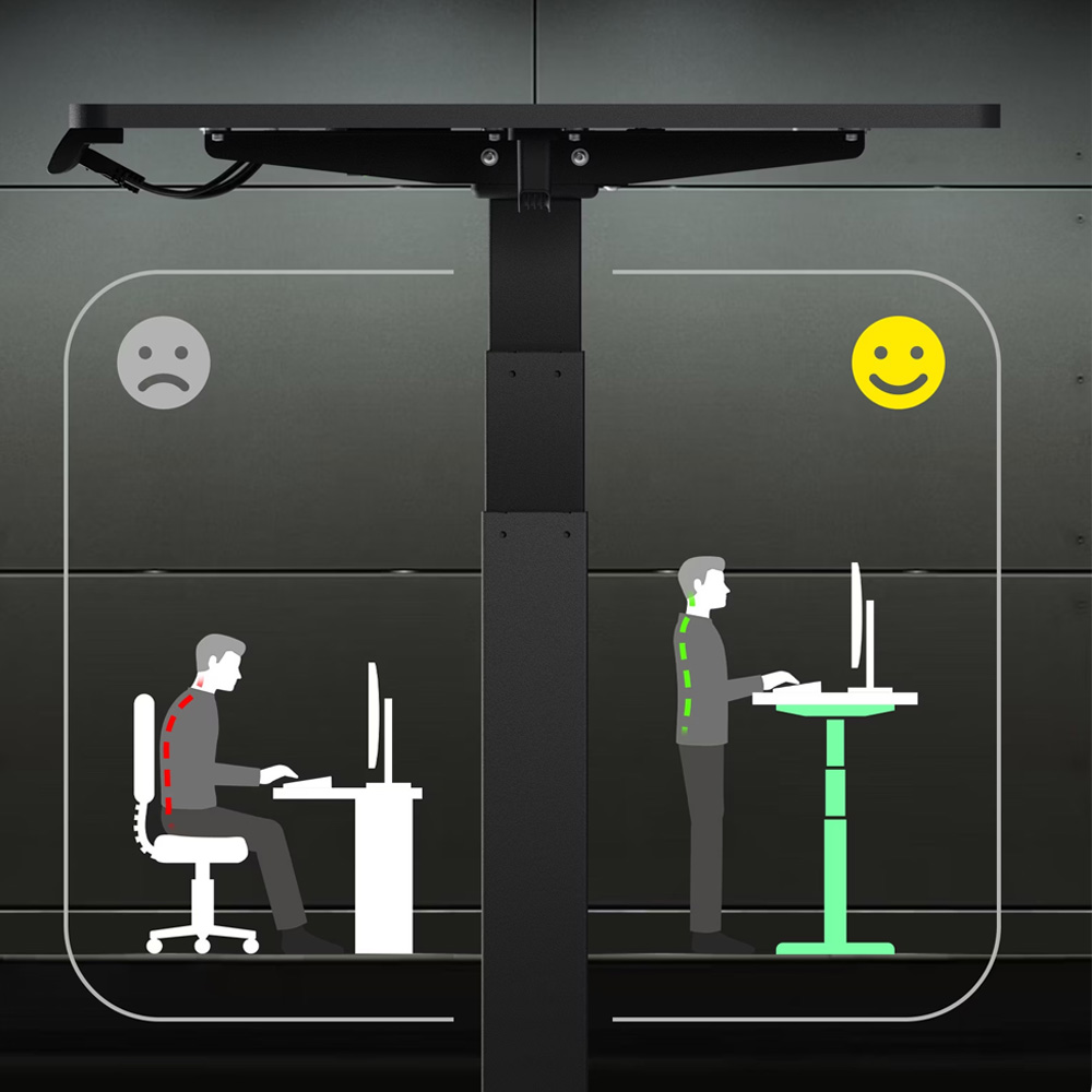 Χάρη στους δύο αθόρυβους κινητήρες, το γραφείο ρυθμίζεται ομαλά σε ύψος με ταχύτητα 30 mm/s, επιτρέποντας τη μετάβαση από το κάθισμα στο στέ standing σε δευτερόλεπτα. Η διαδικασία ρύθμισης γίνεται απλά με το πάτημα ενός κουμπιού.