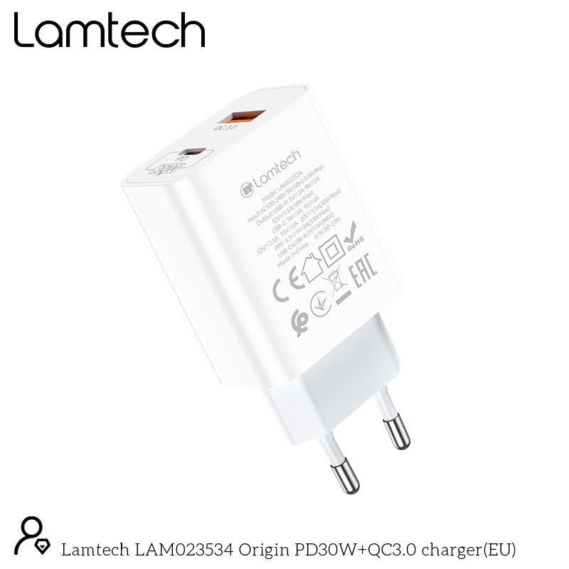 Ο Φορτιστής LAMTECH 30W Γρήγορης Φόρτισης διαθέτει 1 θύρα USB QC3.0 και 1 θύρα Type-C PD, προσφέροντας γρήγορη και αξιόπιστη φόρτιση για τις συσκευές σας, όλα σε κομψό, φορητό σχέδιο ιδανικό για ταξίδια.