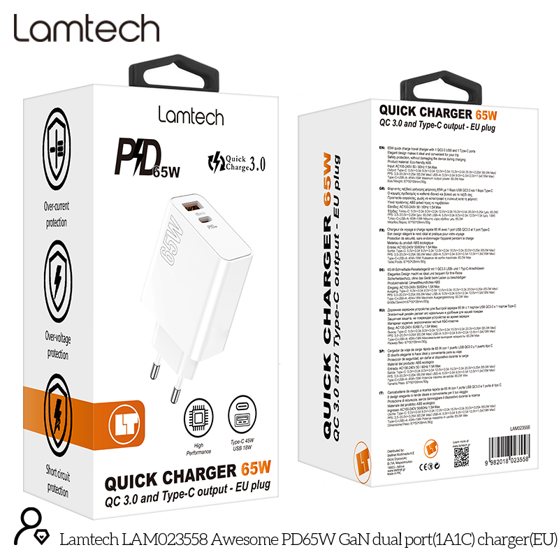 Γρήγορη και ασφαλής φόρτιση για όλες τις συσκευές σας! Ο LAMTECH 65W Fast Charger προσφέρει ταχύτατη και αξιόπιστη φόρτιση, διαθέτοντας μία θύρα USB QC3.0 και μία θύρα Type-C για μέγιστη συμβατότητα.