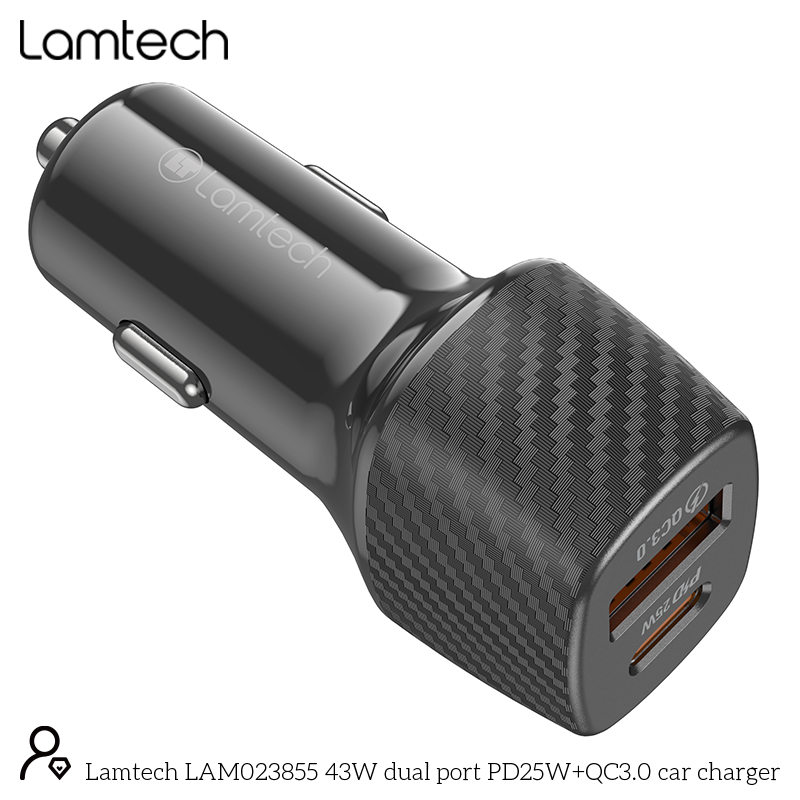 LAMTECH DUAL PORT CAR FAST CHARGER  TYPE-C PD 25W & USB 18W BLACK LAMTECH DUAL PORT CAR FAST CHA...