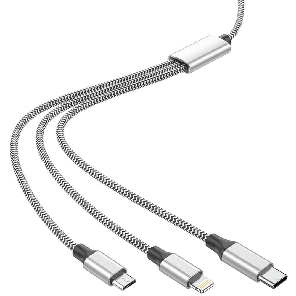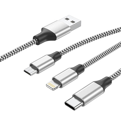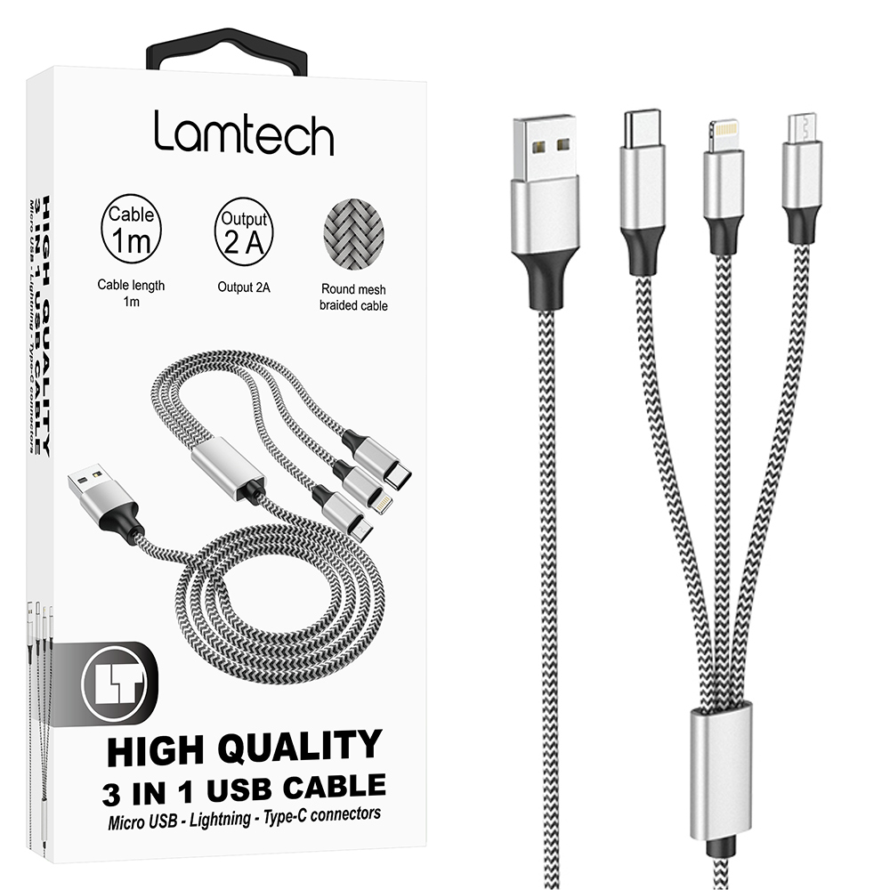 • LAMTECH HIGH QUALITY 3 IN 1 USB CABLE WITH METALLIC SHELL SILVER 1M