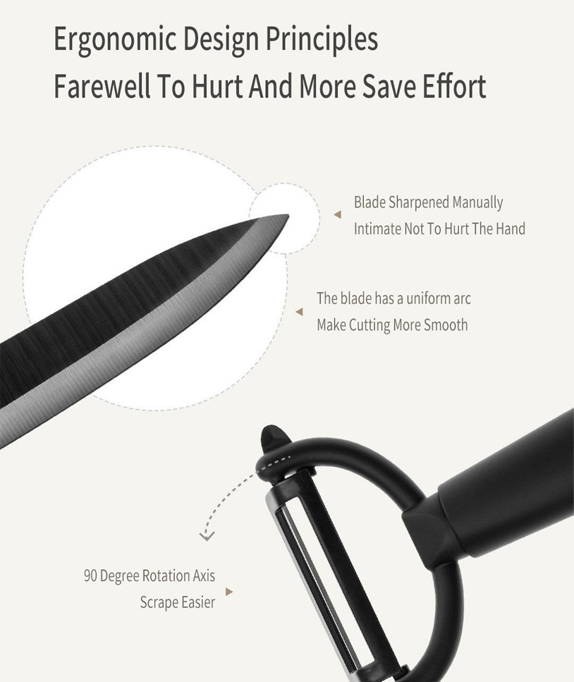 Το σετ μαχαιριών της MIJIA αποτελείται από ένα 3 μαχαίρια και 1 αποφλοιωτή εξαιρετική ποιότητας, κατασκευασμένα από κεραμικό υλικό, που διακρίνεται για την υψηλή απόδοση και την μεγάλη αντοχή στον χρόνο. Τα μαχαίρια έχουν στιβαρή, αντιολισθητική λαβή, η οποία προσφέρει εξαιρετικό κράτημα και μεγάλη σταθερότητα. Τα μαχαίρια έχουν διαφορετικό μέγεθος και καλύπτουν σχεδόν όλες τις εργασίες της κουζίνας, ενώ ο αποφλοιωτής λύνει τα χέρια για ασφαλή καθαρισμό μικρότερων φρούτων ή λαχανικών. Τα μαχαίρια είναι ανθεκτικά στην σκουριά και την διάβρωση και διατηρούνται αιχμηρά ακόμη και μετά από μεγάλη περίοδο χρήσης.