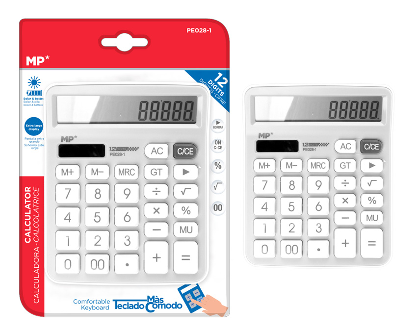 MP αριθμομηχανή PE028, ηλιακό & μπαταρίες, 12 ψηφία, λευκή