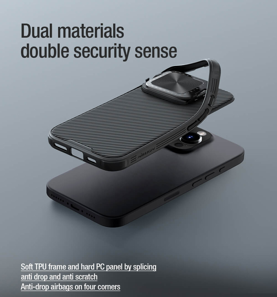 Η θήκη της σειράς CamShield Prop της Nillkin χαρακτηρίζεται από την ενισχυμένη προστασία που προσφέρει, το σκληρό υλικό κατασκευής της με την ανάγλυφη επιφάνεια, αλλά και την έξτρα προστασία των καμερών και της ιδιωτικότητας σας, χάρη στο ανοιγόμενο μεταλλικό καπάκι καμερών, το οποίο μπορεί να χρησιμοποιηθεί και ως stand.