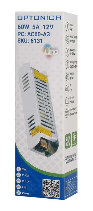 Τροφοδοτικό ισχύος 60W της Optonica, κατάλληλο για την τροφοδοσία LED καλωδιοταινίων.