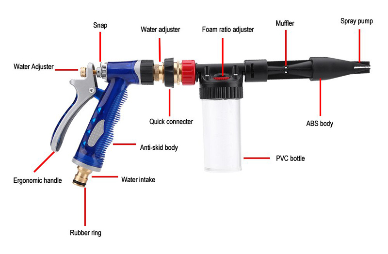 Πιστόλι καθαρισμού αυτοκίνητου κατασκευασμένο από υψηλής ποιότητας υλικά που εξασφαλίζουν την αξιοπιστία και την απρόσκοπτη λειτουργία του. Διαθέτει δοχείο χωρητικότητας 100ml για την τοποθέτηση του απορρυπαντικού ενώ μπορεί να αποσυναρμολογηθεί εύκολα όταν δεν χρησιμοποιείται για να μην καταλαμβάνει πολύ χώρο.