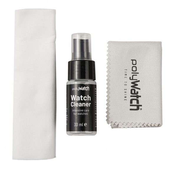 Εξαιρετικό kit από την Polywatch για τον καθαρισμό ρολογιών, που αποτελείται από υγρό σπρέι καθαρισμού, πανάκι γυαλίσματος και πανάκι μικροϊνών.