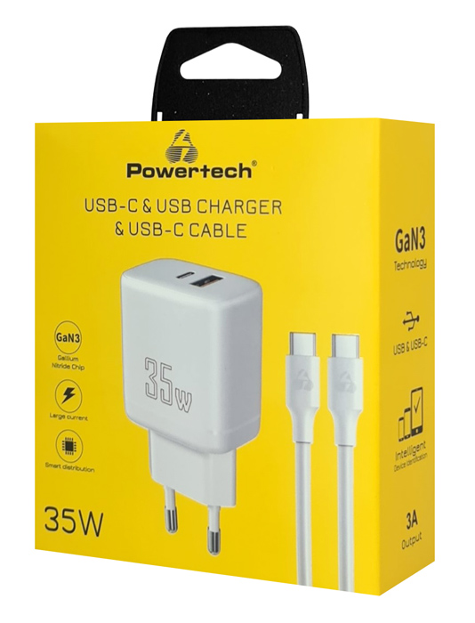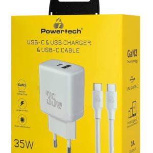POWERTECH φορτιστής τοίχου PT-1179, καλώδιο, USB/USB-C, 35W, GaN, λευκός