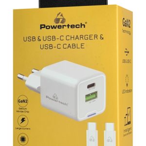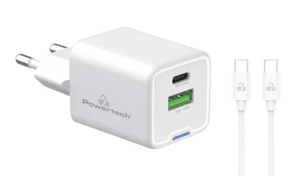 POWERTECH φορτιστής τοίχου PT-1224, καλώδιο, USB/USB-C, 33W, GaN, λευκός