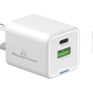 Υψηλής απόδοσης φορτιστής τοίχου της Powertech, κατασκευασμένος από ανθεκτικό υλικό και συμβατός με συσκευές που φορτίζουν μέσω θύρας USB. Διαθέτει USB και USB-C θύρες εξόδου που υποστηρίζουν φόρτιση με μέγιστη συνολική απόδοση 33W.