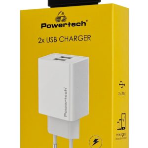 Υψηλής απόδοσης φορτιστής τοίχου της Powertech, κατασκευασμένος από ανθεκτικό υλικό και συμβατός με συσκευές που φορτίζουν μέσω θύρας USB. Διαθέτει 2x USB θύρες εξόδου που υποστηρίζουν φόρτιση με απόδοση έως 12W.