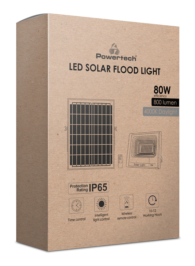 LED ηλιακός προβολέας εξωτερικού χώρου της Powertech με ισχύ 80W. Ενσωματώνει αισθητήρα φωτός που επιτρέπει την αυτόματη ενεργοποίηση του φωτιστικού την νύχτα και απενεργοποίηση του την ήμερα.