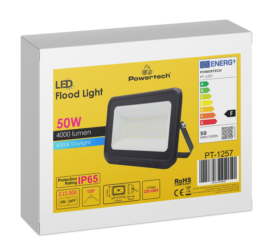 Powertech LED προβολέας εξωτερικού χώρου ισχύος 50W και φωτεινή ροή 4000 lumens.