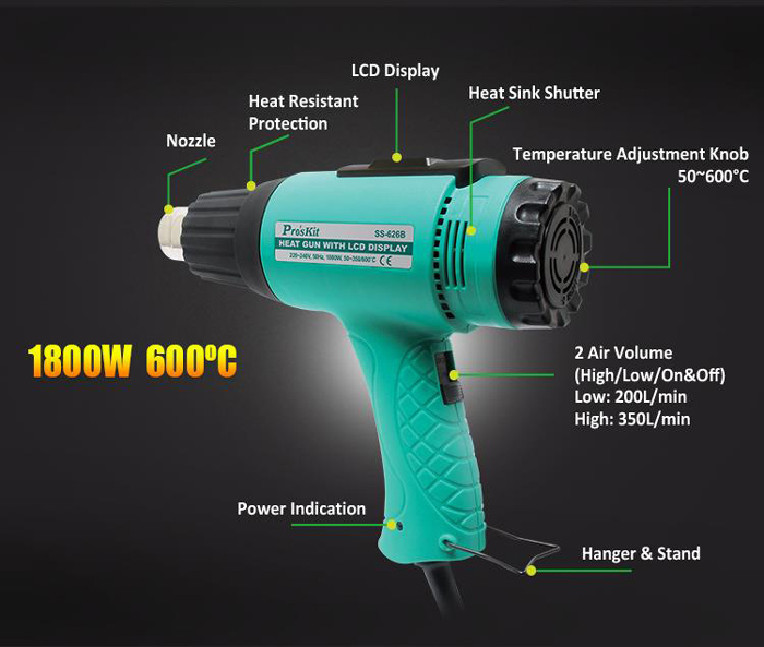 PROSKIT πιστόλι θερμού αέρα SS-626B με οθόνη, 1800W, 50~600 °C