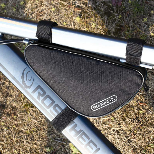 Τσαντάκι ποδηλάτου που προσαρμόζετε στο μπροστινό μέρος, ανάμεσα στους δύο άξονες. Το τριγωνικό του σχήμα προσφέρει άψογη εφαρμογή άψογη εφαρμογή και προστασία. Είναι κατασκευασμένο από υψηλής ποιότητας υλικά, αδιάβροχο, με ενισχυμένη δομή ώστε να μην παραμορφώνεται. Είναι ιδιαίτερα ευρύχωρο, ιδανικό για την τοποθέτηση γαντιών, γυαλιών και άλλων εργαλείων και εξαρτημάτων του ποδηλάτου.