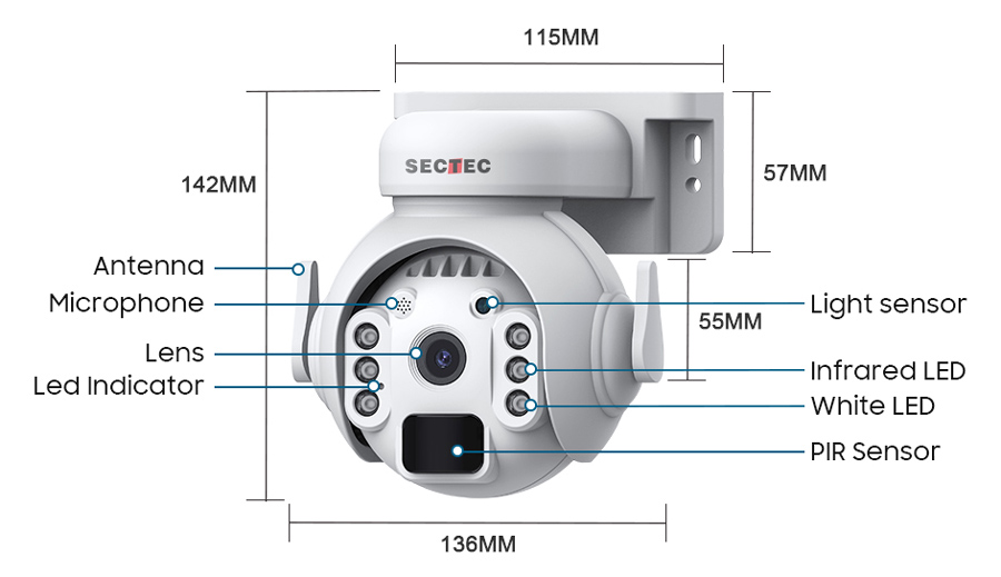 -PTZ angle: Horizontal 355° Vertical 90° (rotatable)