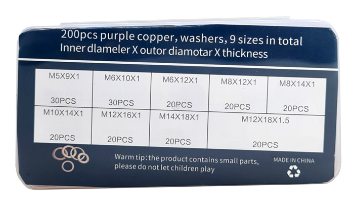 Σετ που αποτελείται από 200 χάλκινες ροδέλες σε διάφορα μεγέθη. Όλα τα εξαρτήματα του σετ είναι τοποθετημένα μέσα σε διάφανη πλαστική θήκη για την εύκολη τακτοποίηση και μεταφορά τους.