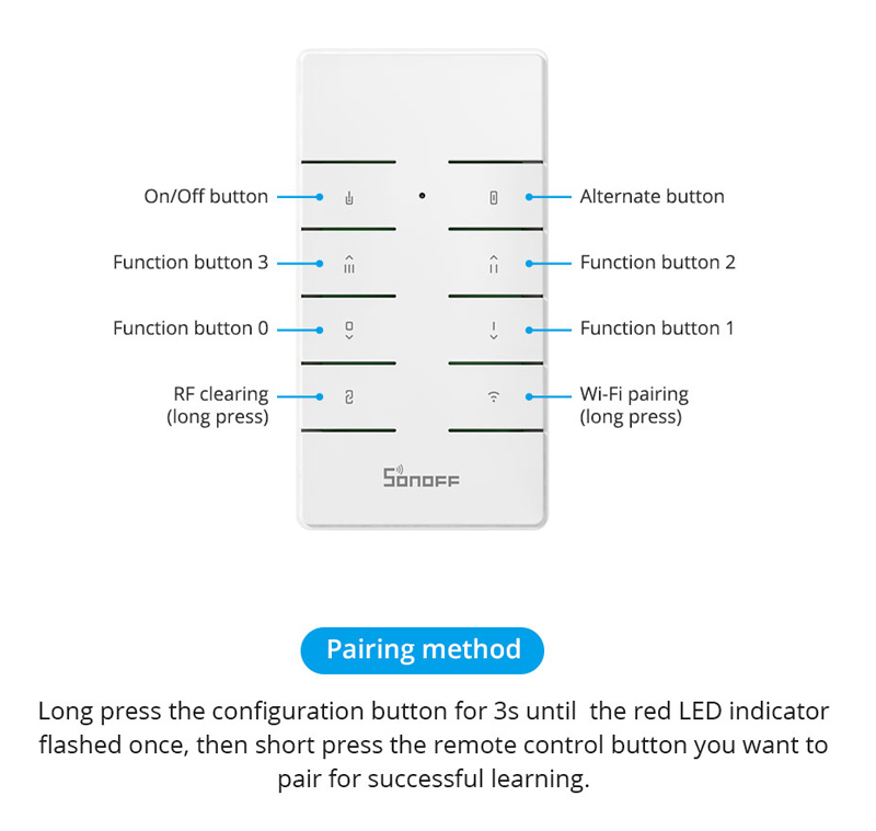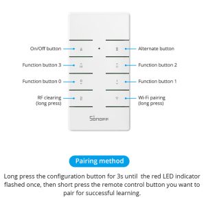 Το remote controller RM433R2 διαθέτει 8 πλήκτρα για εκτέλεση διάφορων εργασιών, σε διαφορετικού τύπου συσκευές. Έχει κομψή, μίνιμαλ εμφάνιση και μεγάλη συμβατότητα, καθώς μπορεί να συνδεθεί πληθώρα συσκευών της Sonoff όπως RFR2, RFR3, Slampher R2, iFan03, D1, 4CHProR3, TX series, RF BridgeR2 και άλλες συσκευές που υποστηρίζουν το 433MHz πρωτόκολλο επικοινωνίας.