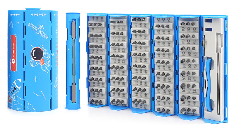 Σετ κατσαβιδιών της Sunshine το οποίο αποτελείται από μαγνητικό κατσαβίδι, προέκταση, μαγνητιστή, τσιμπίδα, καρφίτσα εξαγωγής, εργαλεία ανοίγματος και 120 διαφορετικές μύτες κατσαβιδιού.