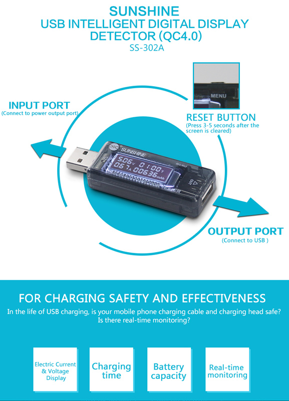 SUNSHINE USB tester φόρτισης SS-302A, V/A/Time/mAh