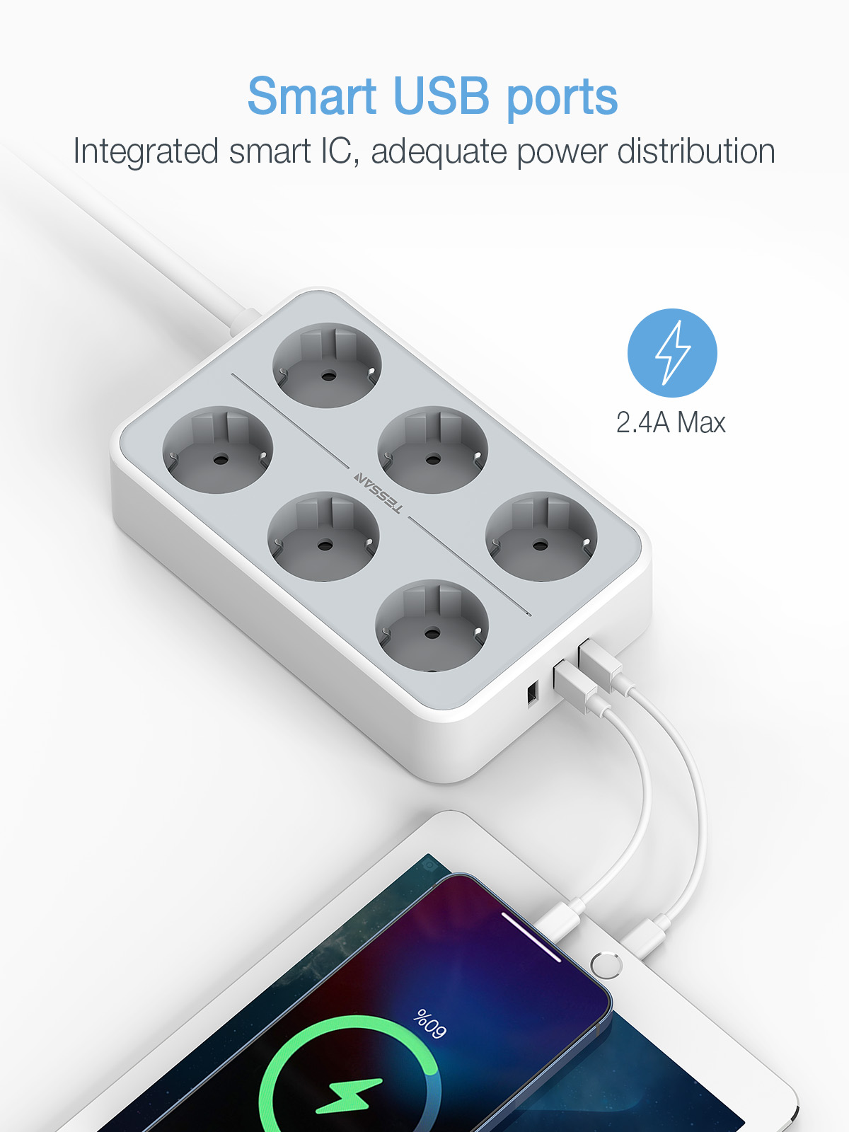 - Σχεδιασμός 9 σε 1: Με 6 πρίζες SCHUKO και 3 θύρες USB, το πολύπριζο σας επιτρέπει να συνδέσετε έως και 9 συσκευές ταυτόχρονα.
