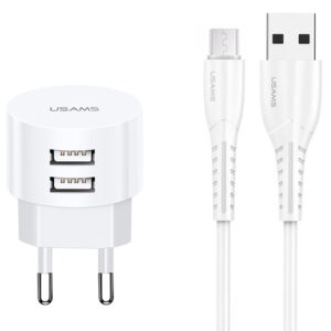 USAMS φορτιστής τοίχου T20 & καλώδιο Micro USB, 2x USB, 2.1A, λευκός