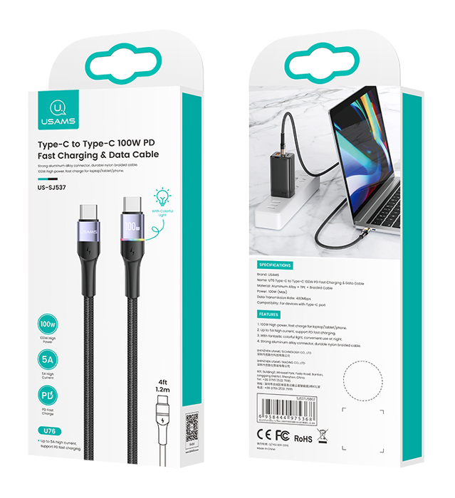 USAMS καλώδιο USB Type-C US-SJ537, 100W/5A, PD, 1.2m, μαύρο