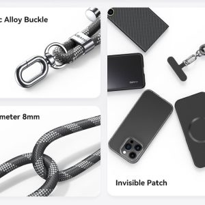 Είναι ρυθμιζόμενο και αποτελείται από 2 μέρη, το κορδόνι και ένα υφασμάτινο κομμάτι το οποίο τοποθετείται στο εσωτερικό της θήκης του κινητού, επιτρέποντας το κρέμασμα του από τον γάντζο του κορδονιού.