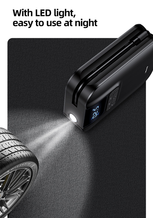 Εξοπλίζεται με μπαταρία υψηλής χωρητικότητας και φώτα LED, για λειτουργία σε σκοτεινό περιβάλλον. Εκτός από τα αυτοκίνητα η χρήση του είναι κατάλληλη και για ποδήλατα, μηχανές, φουσκωτές μπάλες κλπ.